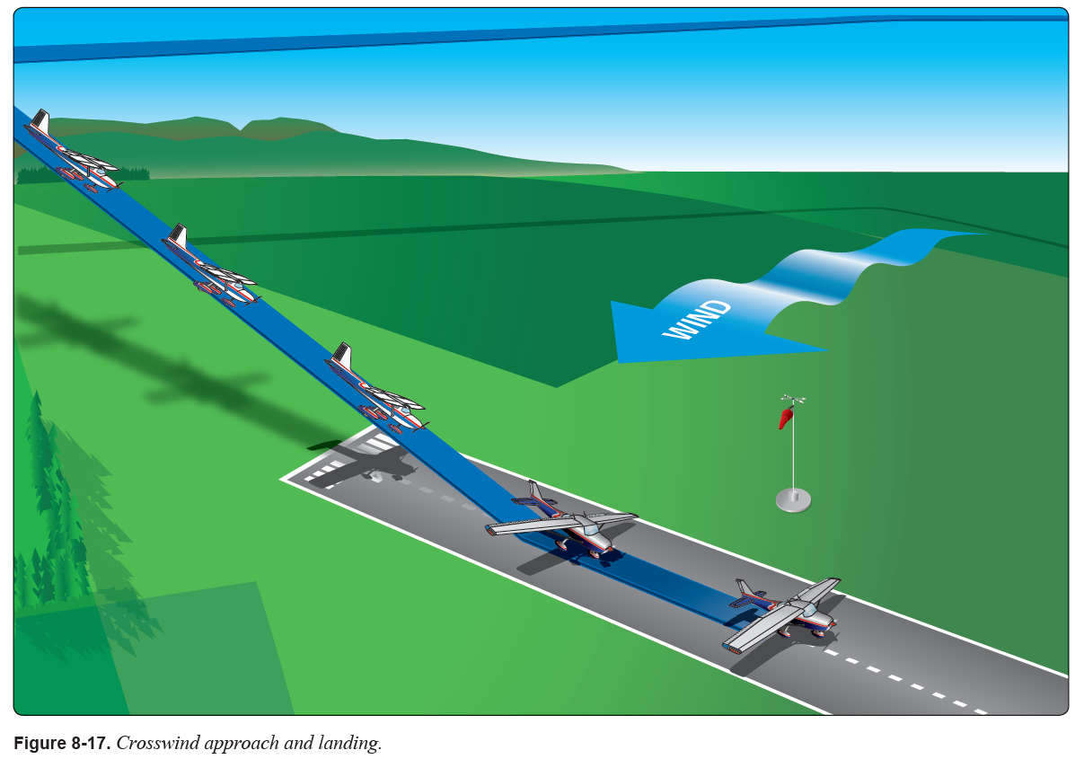 - wing low method 는 윙을 바람이 오는 쪽으로 기울려 주고 turn 하려는 것을 반대쪽 rudder 로 막아 주는 것입니다. 그러니 한 쪽 윙이 내려간 상태로 경로를 따라 가겠죠.