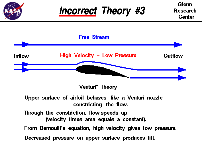 - The part of the theory about Bernoulli's equation and a difference in pressure existing across the airfoil is correct. In fact, this theory is very appealing because there are parts of the theory that are correct. In our discussions on pressure-area integration to determine the force on a body immersed in a fluid, we mentioned that if we knew the velocity, we could obtain the pressure and determine the force. The problem with the "Venturi" theory is that it attempts to provide us with the velocity based on an incorrect assumption (the constriction of the flow produces the velocity field). We can calculate a velocity based on this assumption, and use Bernoulli's equation to compute the pressure, and perform the pressure-area calculation and the answer we get does not agree with the lift that we measure for a given airfoil.