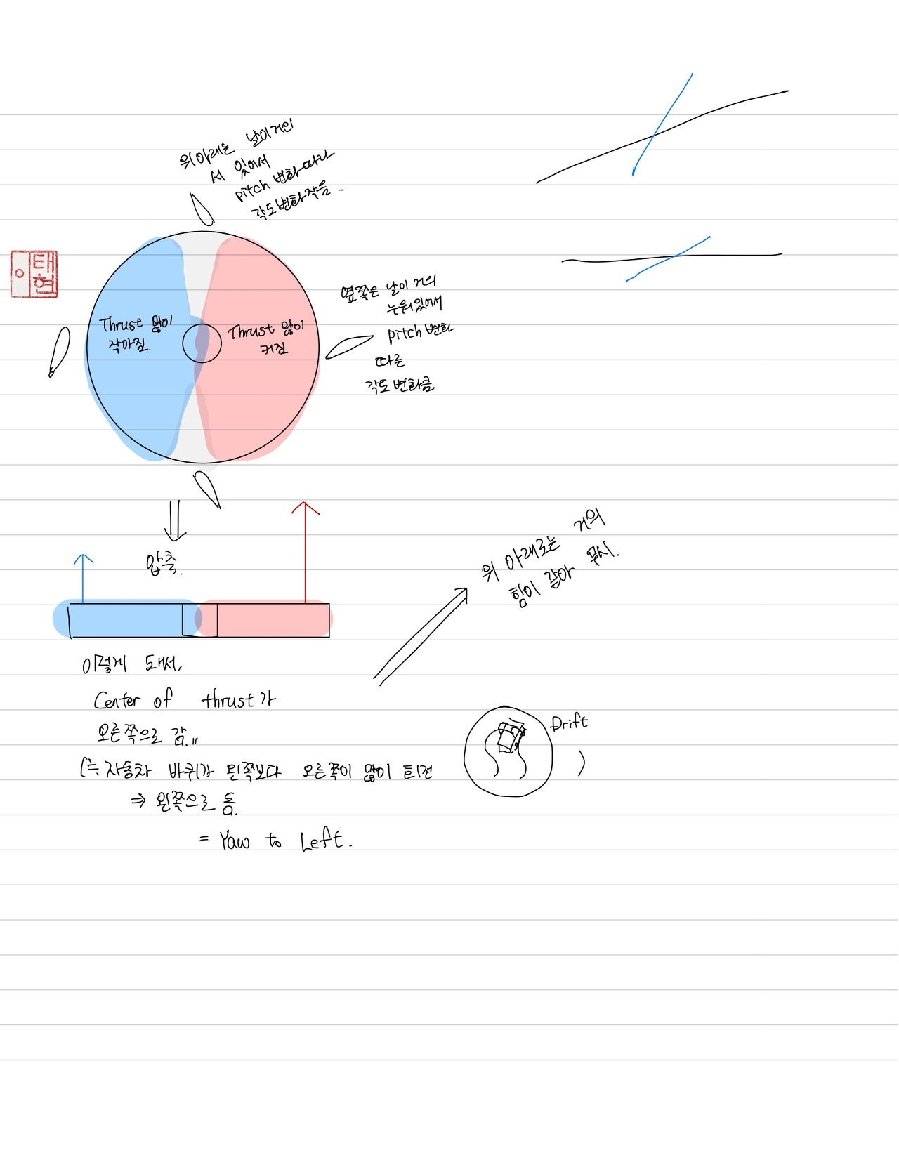이렇게 Descending Blade 의 thrust 가 Ascending blade보다 크기 때문에 Center of thrust 는 오른쪽(Descending)으로 가게 됩니다.(Yaw to left)