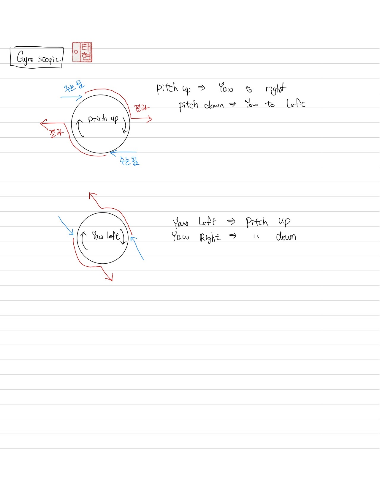 Gyroscopic action : 90도 뒤 (Pitch 들 때는 Roll to Right)