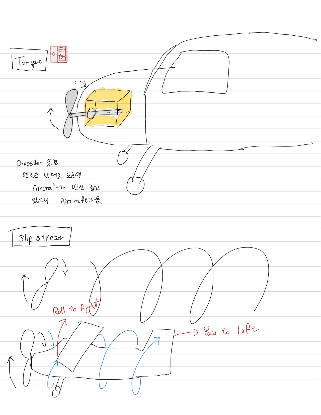 Propeller는 엔진(+shaft) 에 의해서 돌게 되고 엔진 내부에서는 직선 운동을 회전 운동으로 바꾸는 일이 일어나게 됩니다. 엔진에 대해서는 자세히 할 필요가 없을 것 같고, 중요한 것은 Propeller 를 돌리기 위해 열심히 뛰고 있는 Engine 이 있다는 말입니다. 이 Engine 은 Aircraft에 붙어있죠. 그리고 뉴턴의 제3법칙에 의하여 시계방향으로 회전하는 Prop. 그리고 그 Prop. 의 반작용으로 반 시계 방향으로 기체는 Roll 하려는 힘이 발생하게 됩니다. 이것이 Torque로 인한 Turning Tendency 입니다.