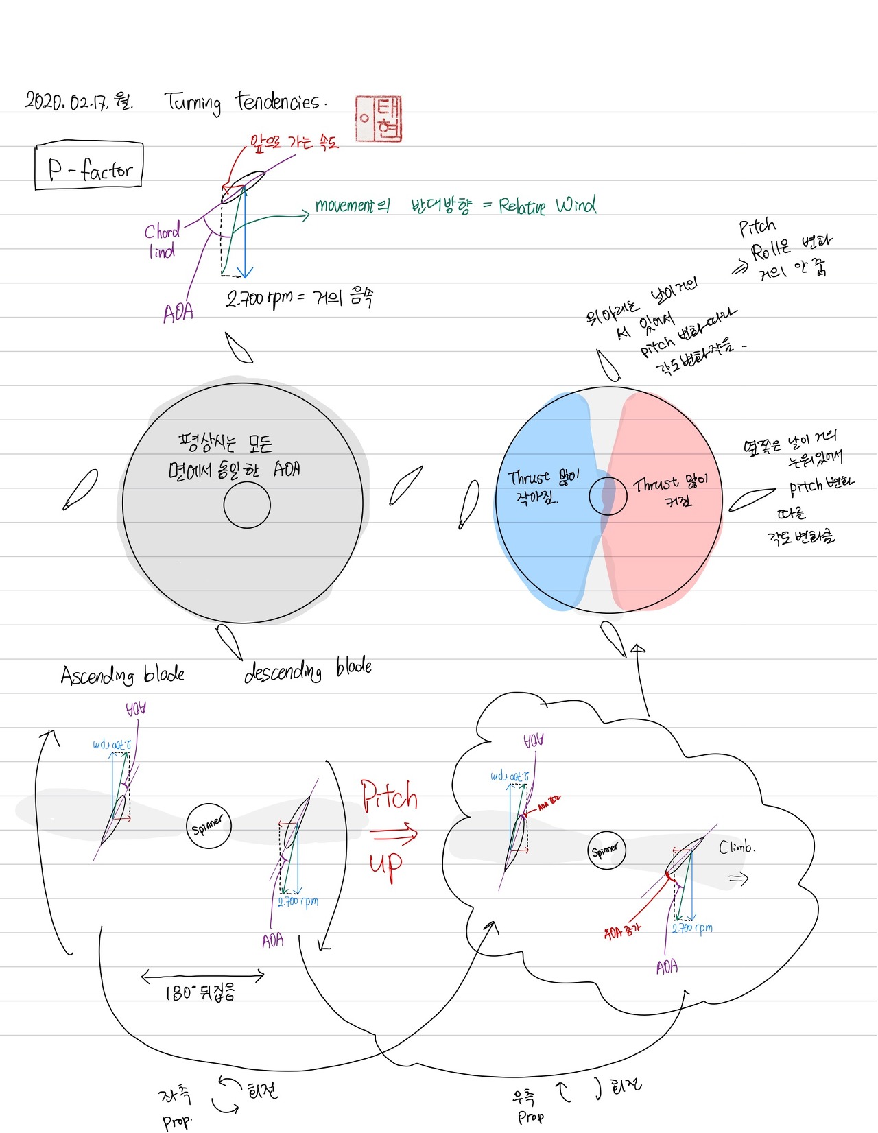 회전하는 Prop. 의 뒤로 와류가 발생하게 됩니다. 통돌이 세탁기와 비슷합니다. 통돌이 세탁기가 회전할 때 안에서 와류가 발생하죠. 이와 비슷한 와류가 회전하는 Prop 뒤에서 발생하게 됩니다. (저번에 Wake turbulence 에서 보였던 그런 와류가 생기게 되는 것이죠.) 이 와류는 기체 주변을 따라 뒤로 가게 됩니다. 이 와류는 주로 왼쪽 윙을 밑에서 위로 치고(Roll to right), Vertical stabilizer 를 왼쪽에서 오른쪽으로 치게 됩니다(Yaw to Left).