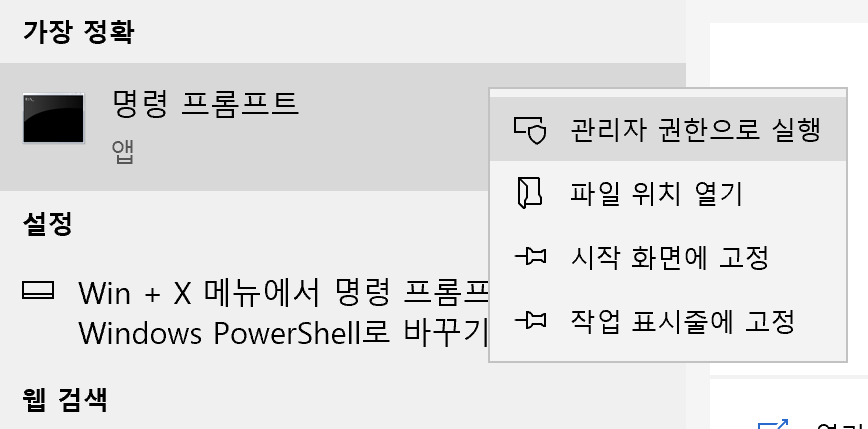 Window 버튼 -> cmd 입력 -> 관리자 권한으로 실행 클릭