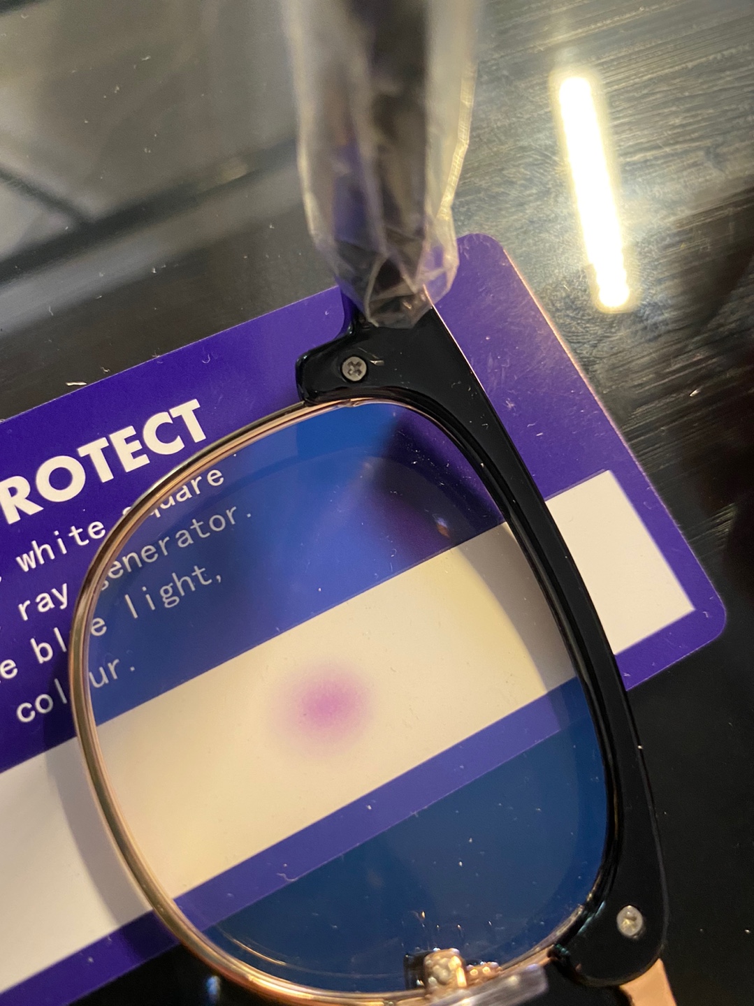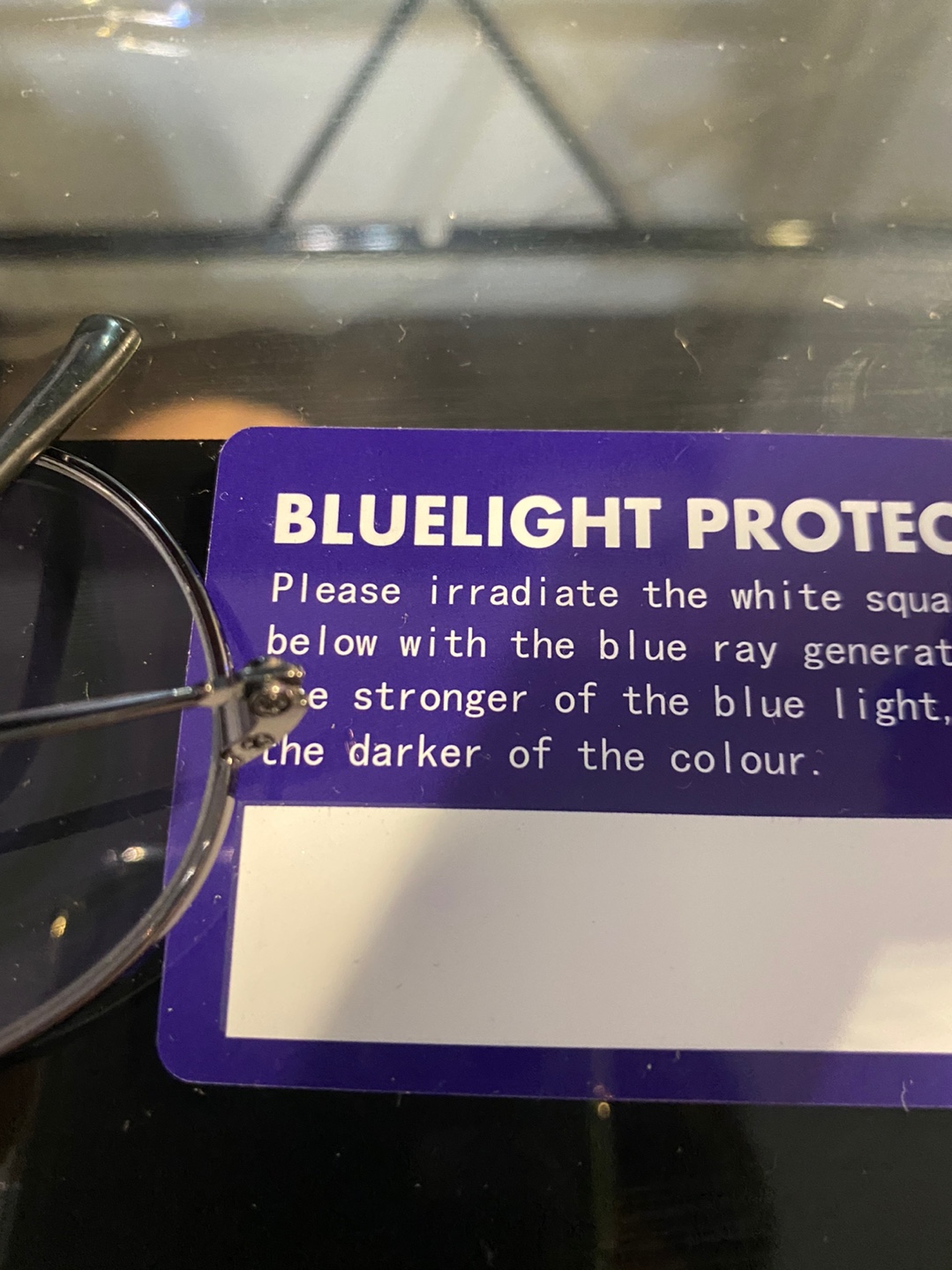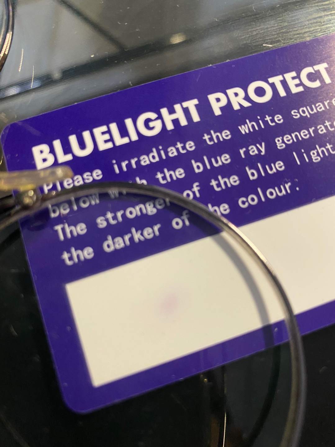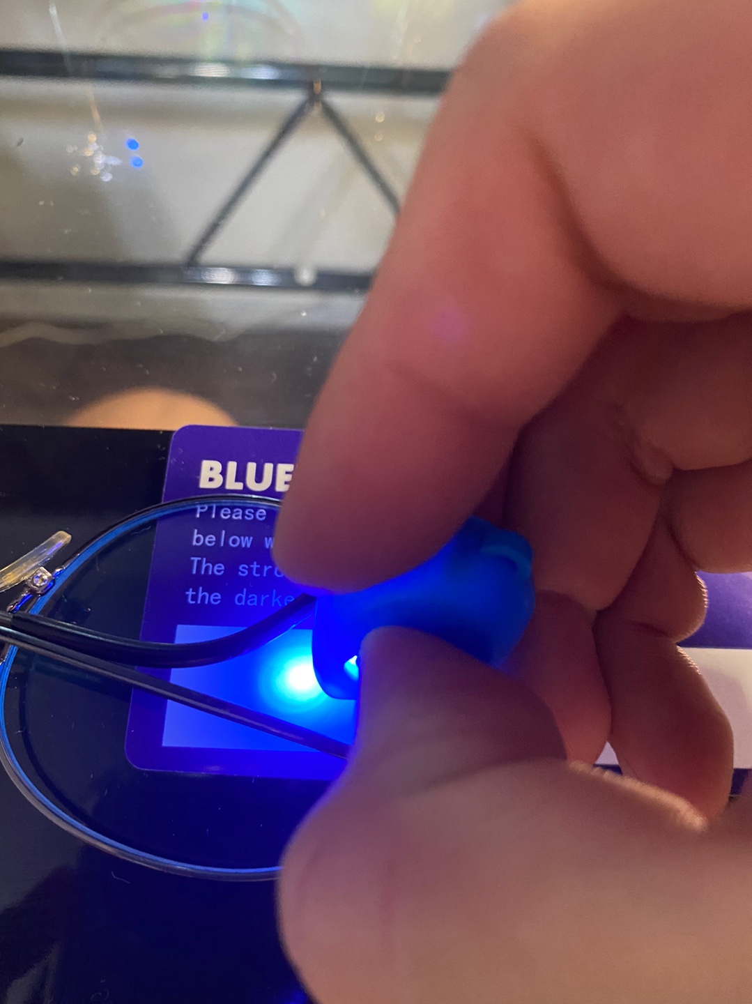 이 안경은 살짝 누런 빛을 내는 안경인데 이렇게 10초를 쏘았을 경우 딱 저정도 색깔이 변했어요.