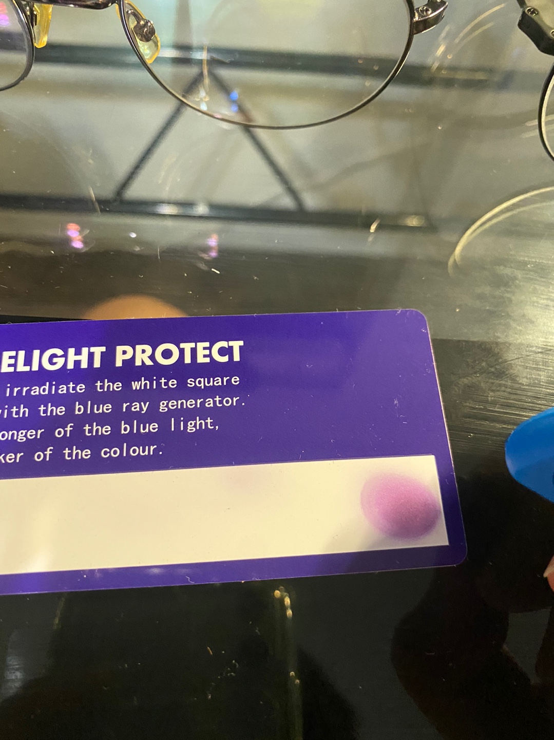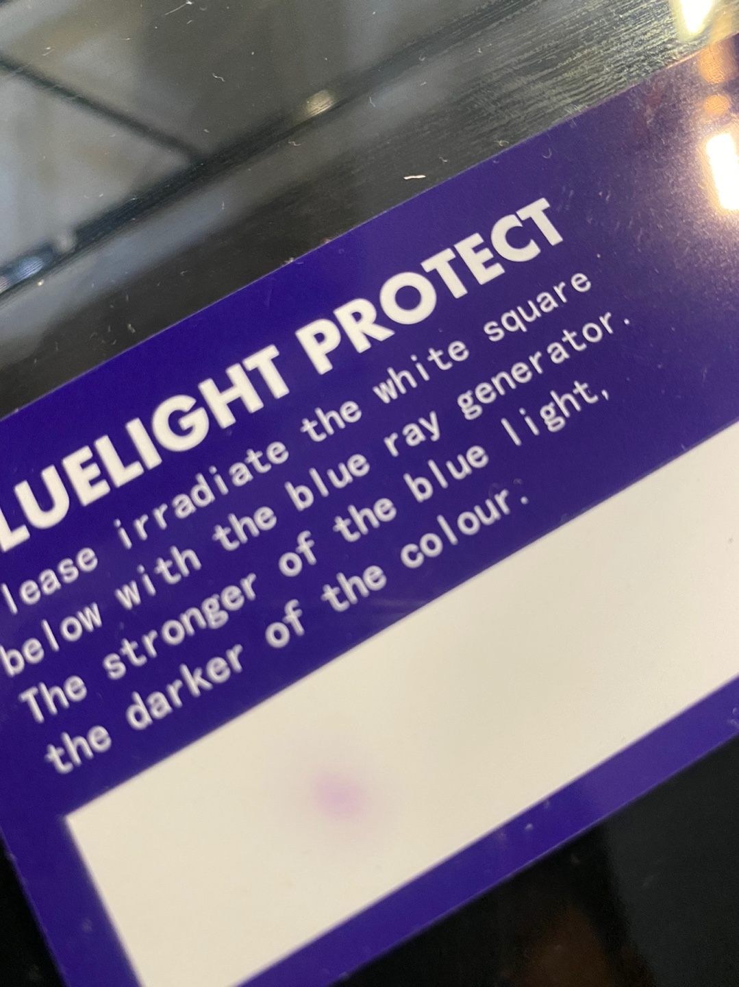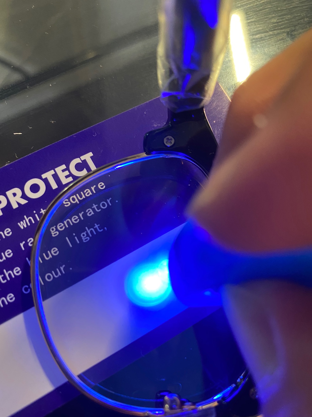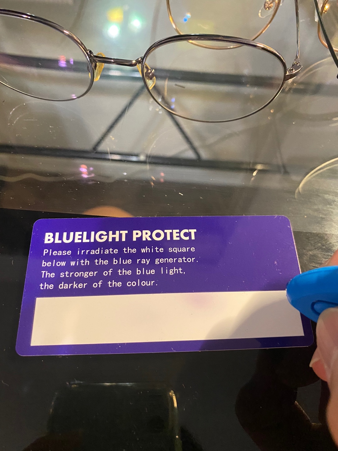 이 안경은 살짝 누런 빛을 내는 안경인데 이렇게 10초를 쏘았을 경우 딱 저정도 색깔이 변했어요.