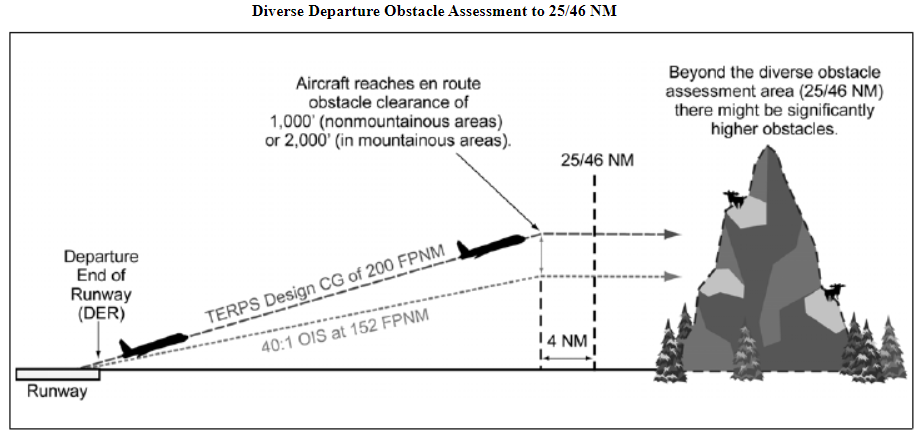 기본적으로 DER (departure end of runway) 에서 35 feet 로 부터 400 feet 에서 첫번째 turn 을 만들기 까지 200 FPNM 을 유지해야 한다. (40:1 OIS 의 경우 152FPNM)