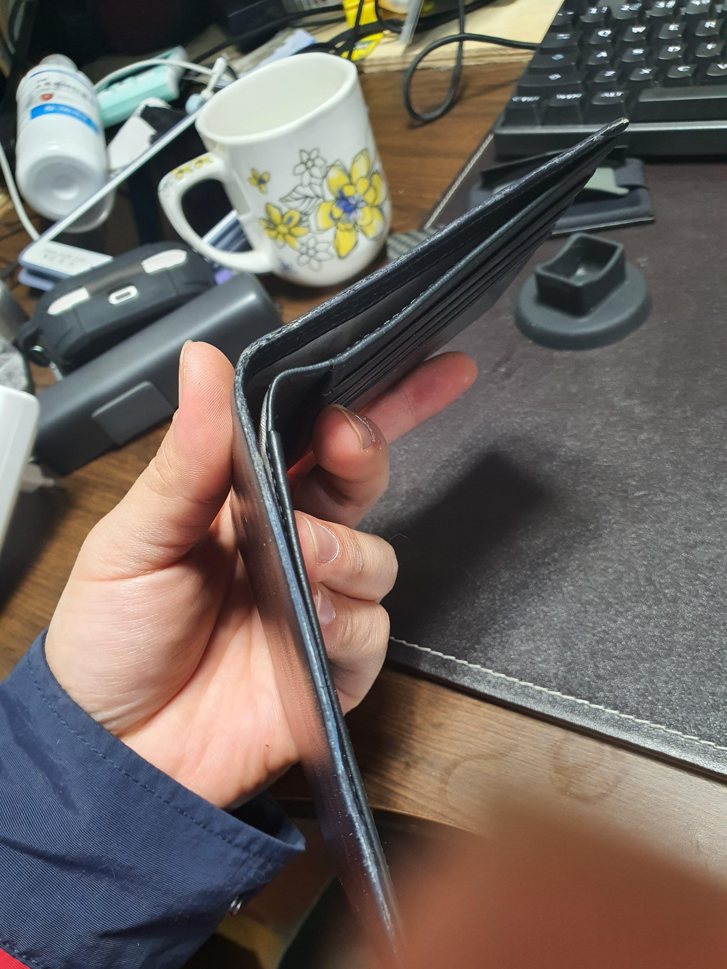 제 지갑은 가죽 두 개가 바느질 없이 붙어있는 제품이에요.