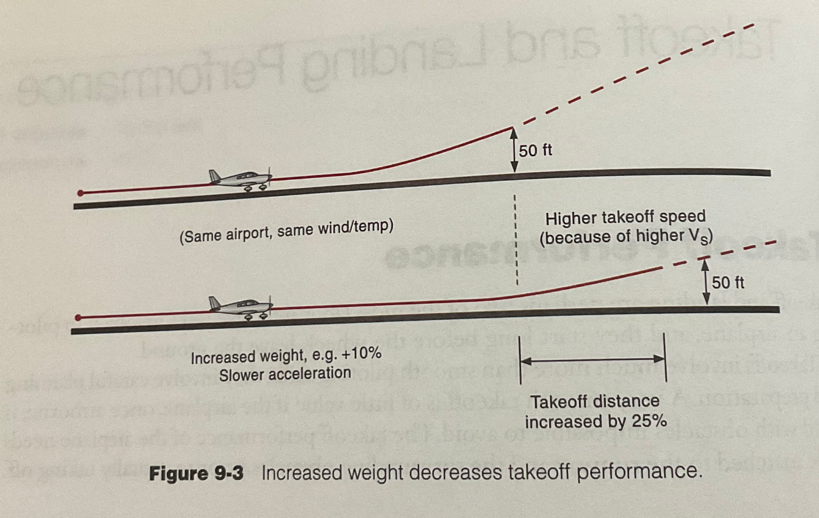 the liftoff speed 는 the stall speed 와 연관되어 있다. 그러므로 무게가 증가할 수록 lift off speed 는 증가하며, climb performance(rate of climb and angle of climb)가 감소하게 된다.
