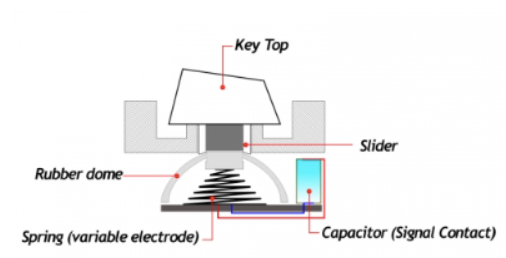- 러버돔이라는 고무가 타건할 때 멤브레인을 누르게 되며 그렇게 되면 입력신호가 가게 된다.