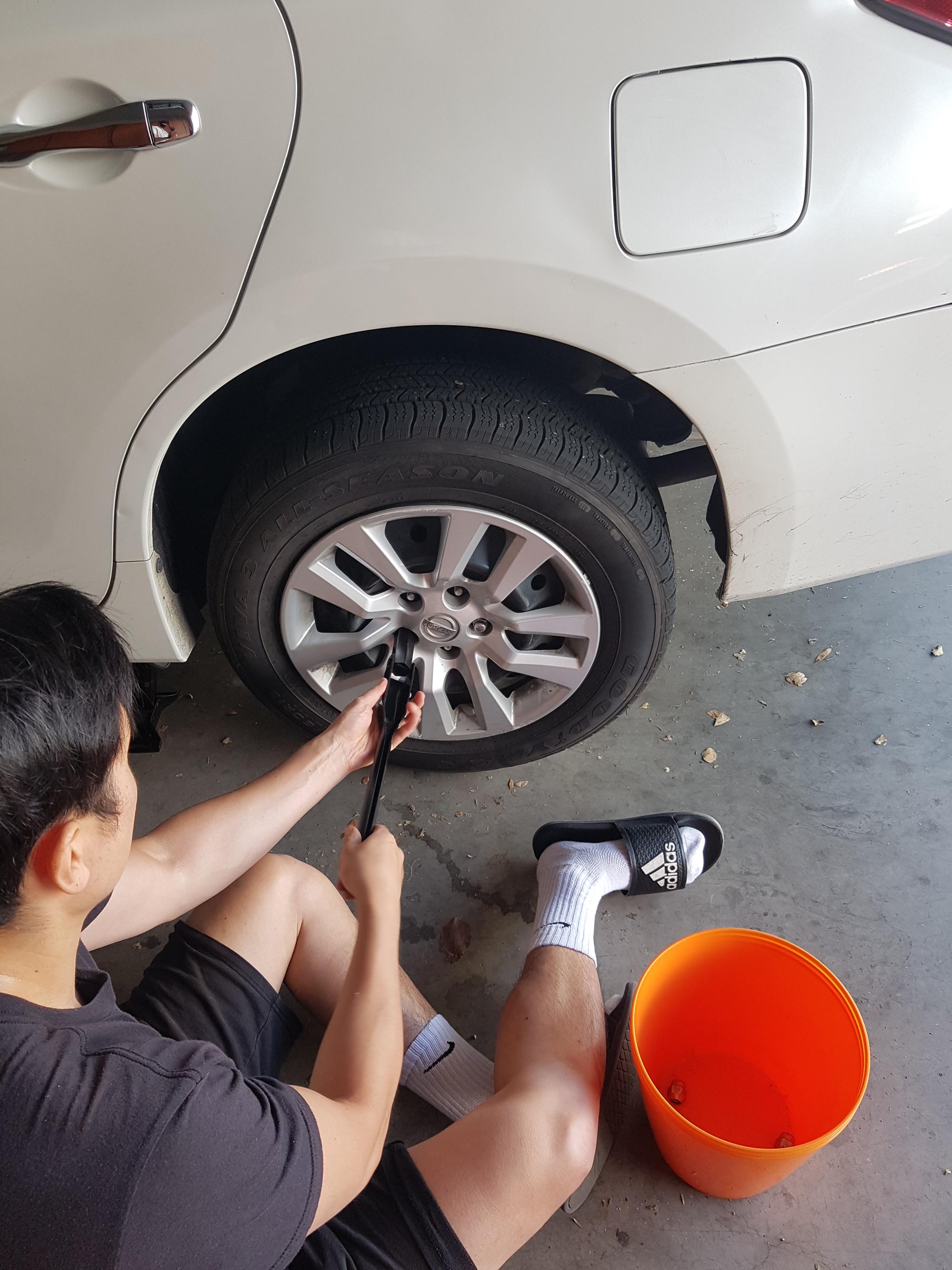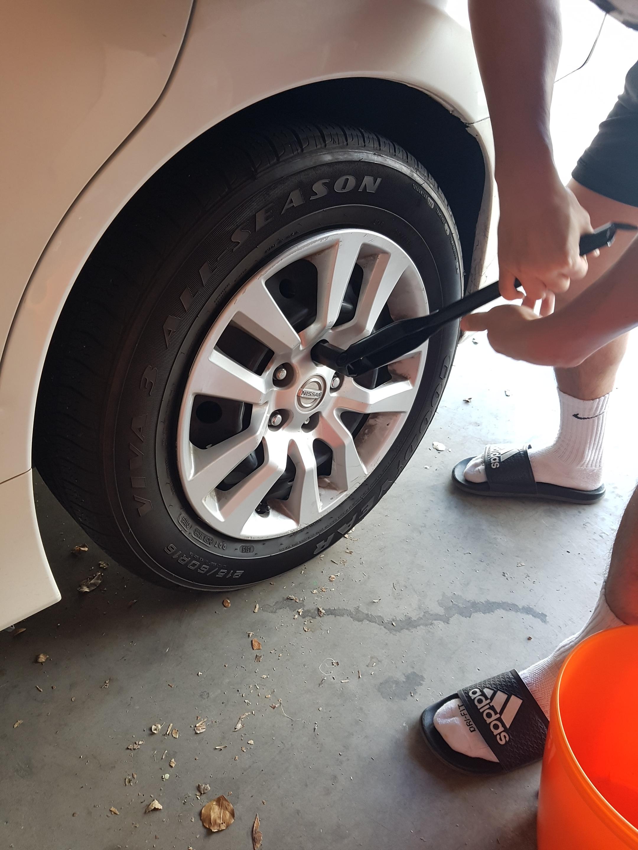 - Tire에 5개의 너트 중 모두 느슨하게 해 주고 2개를 걸어두고 나머지 3개는 빼서 놔두세요.